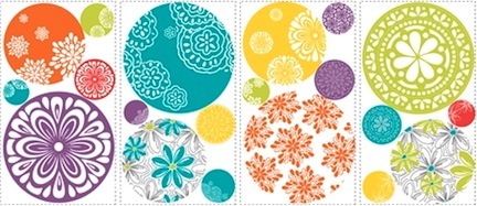 Decorate in seconds with these wall decals from RoomMates! Works on walls, furniture, mirrors, windows, ceramic tiles, accessories and even automotive surfaces. These peel and stick RoomMates decals are the easiest and fastest way to decorate a room. Add a punch of color to any wall or flat surface with these splashy floral patterned dots. This set of 20 removable and repositionable wall decals sports graphic flower patterns in cheerful shades of yellow, lime, plum, orange, and turquoise. These dots would look at home in a wide variety of locations, including children's ... Read more